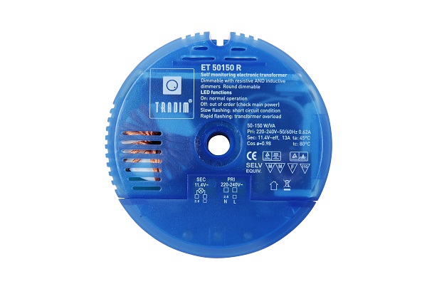 Tradim elektronische halogeen transformator 12V 50-150W rond 105x32mm met gat 11mm