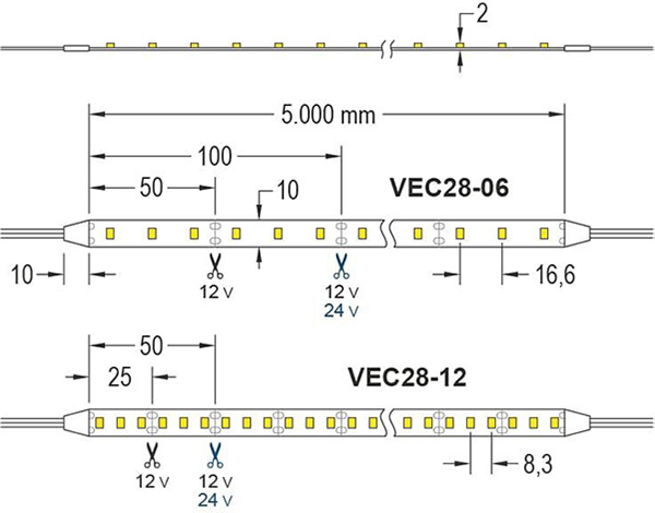 ELT 9955065 eLED VEC28-06-830-24V 30W 24V DC 830 3000K 5m rol flexibele LEDstrip met 3M plakstrip IP20 op aluminium strip plakken i.v.m. koeling