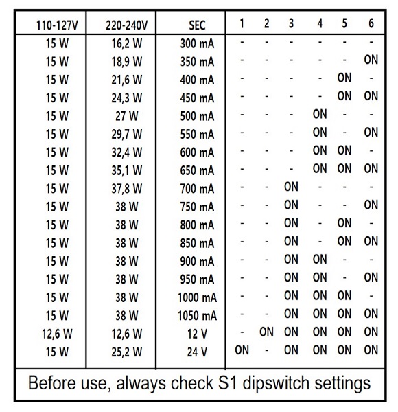 dmv dipswitch intern instelbaar voor verschillende stromen en spanningen. LED stroomsturing 300mA 3-16,2W, 350mA 0,7-18,9W, 400mA 0,8-21,6W, 450mA 0,9-24,3W, 500mA 1,0-27W, 550mA 1,1-29,7W, 600mA 1,2-32,4W, 650mA 1,3-35,1W, 700mA 1,4-37,8W, 750mA 1,5-38W, 800mA 1,6-38W, 850mA 1,7-38W, 900mA 1,8-38W, 950mA 1,9-38W, 1000mA 2-38W en 1050mA 38W